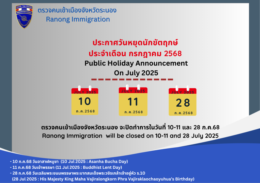 ตรวจคนเข้าเมืองจังหวัดระนอง จะปิดทำการในวันที่ 10-11 และ 28 ก.ค.68