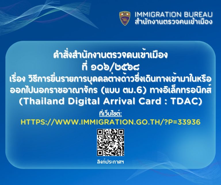 ที่ 106/2568 เรื่อง วิธีการยื่นรายการบุคคลต่างด้าวซึ่งเดินทางเข้ามาในหรือออกไปนอกราชอาณาจักร (แบบ ตม.6) ทางอิเล็กทรอนิกส์ (Thailand Digital Arrival Card : TDAC)