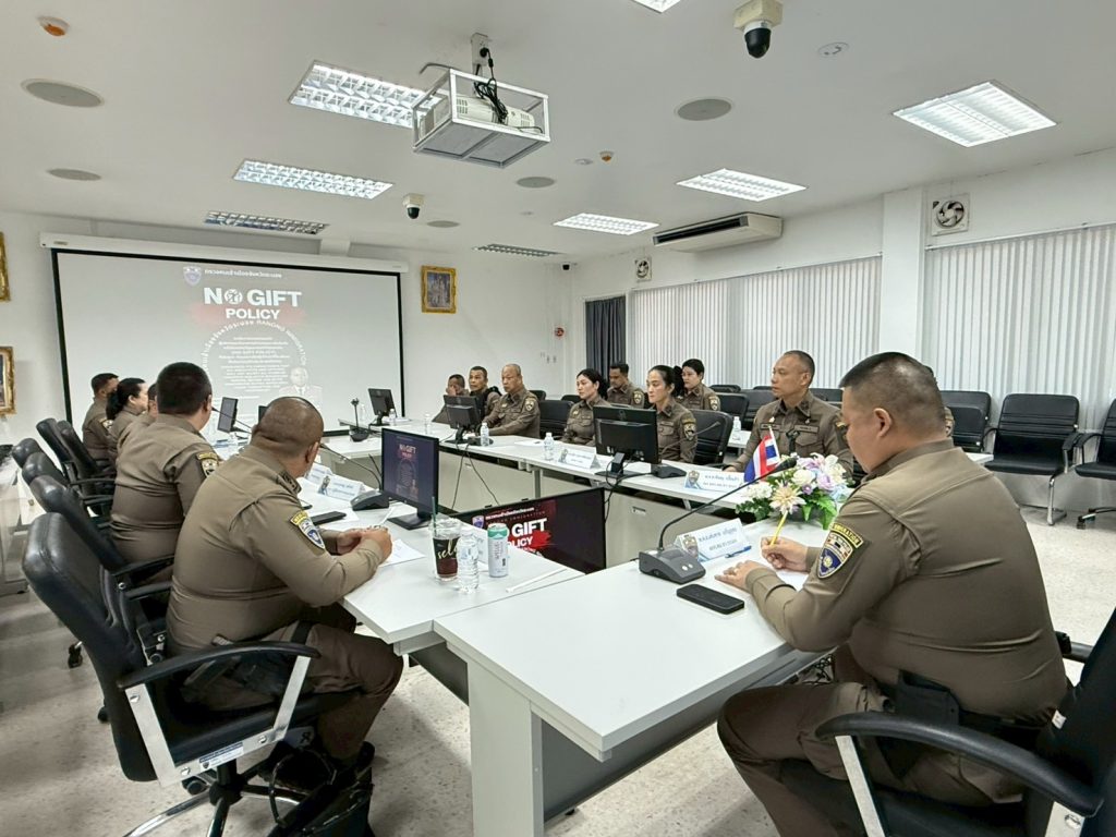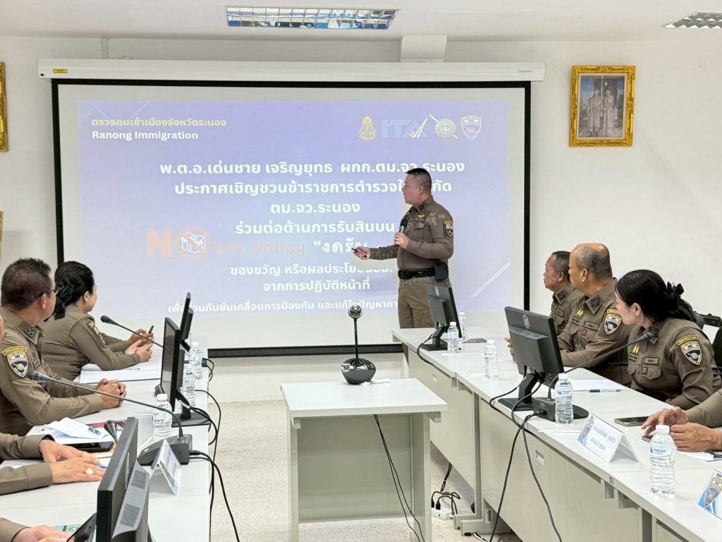 วันที่ 22 ม.ค.69 เวลา 14.30 น. พ.ต.อ.เด่นชาย เจริญยุทธ ผกก.ตม.จว.ระนอง และ ข้าราชการตำรวจในสังกัด ร่วมประกาศนโยบาย ต่อต้านการรับสินบน และชี้แจงประกาศเจตนารมณ์ No Gift Policy “งดรับ – งดให้” โดยกำชับให้ข้าราชการตำรวจ ตม.จว.ระนอง ทุกนาย พร้อมใจปฏิบัติตามนโยบาย และ ดำรงตนเป็นแบบอย่างที่ดีในการไม่รับของขวัญของกำนัล และไม่เรียกรับผลประโยชน์ทุกชนิดทั้งในขณะ ก่อนและหลังปฏิบัติหน้าที่ ที่จะส่งผลให้เกิดการทุจริตและประพฤติมิชอบ ณ ห้องประชุม ศปก.ตม.จว.ระนอง และจุดบริการประชาชน