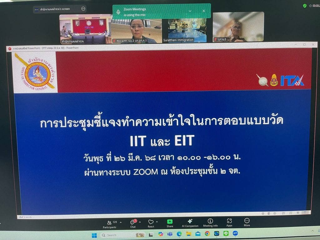 วันที่ 26 มี.ค. 68 เวลา 10.00 น. ภายใต้การอำนวยการของ พล.ต.ต.ทรงโปรด สิริสุขะ ผบก.ตม.6 และ พ.ต.อ.ไพรัช พุกเจริญ รอง ผบก.ตม.6 โดย พ.ต.อ.เด่นชาย เจริญยุทธ ผกก.ตม.จว.ระนอง มอบหมายให้ พ.ต.ต.ธเนศพล ละอองทอง สว.ตม.จว.ระนอง เข้าร่วมการ ประชุมเพื่อชี้แจงทำความเข้าใจเกี่ยวกับการปฏิบัติและข้อคำถามตามแบบวัด IIT และ EIT ผ่าน ระบบ ZOOM ณ ห้องประชุม ตม.จว.ระนอง