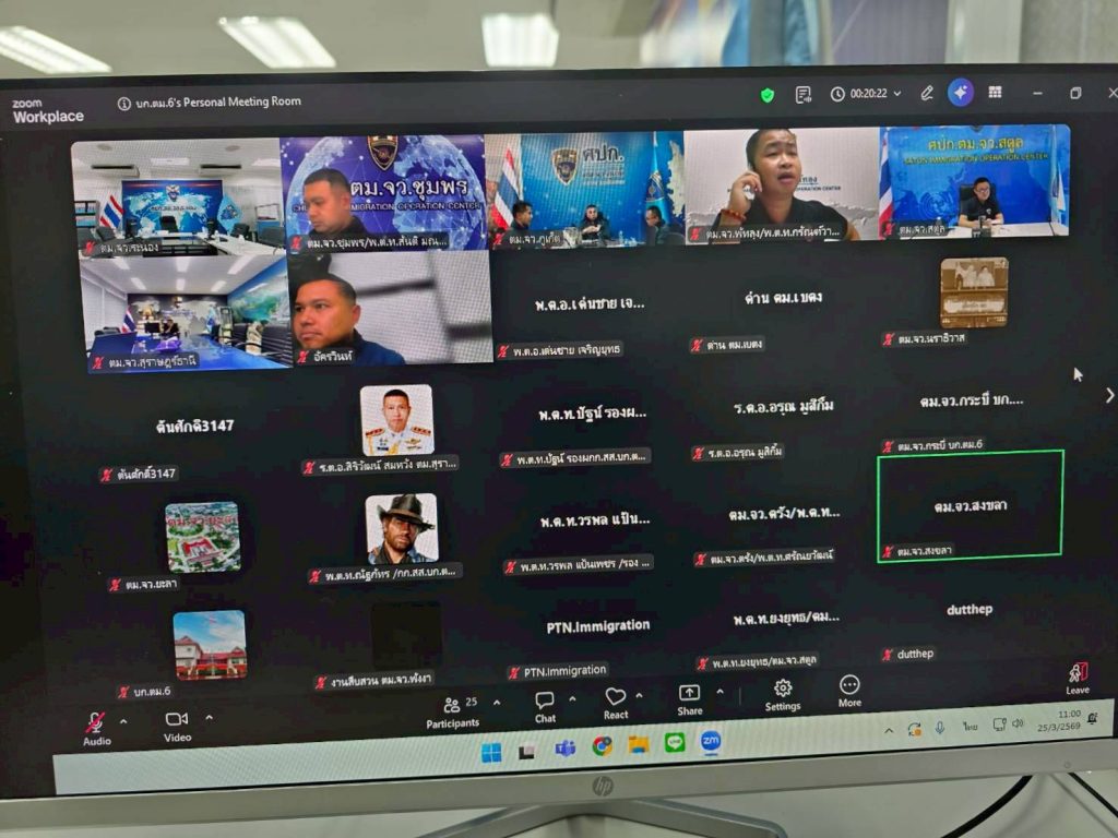 วันนี้ (25 มี.ค.69) เวลา 11.00 น. พ.ต.อ.เด่นชาย เจริญยุทธ ผกก.ตม.จว.ระนอง พร้อมด้วย พ.ต.ท.พิษณุ เบี้ยแก้ว รอง ผกก.ตม.จว.ระนอง เข้าร่วมการประชุมงานสืบสวน เพื่อติดตามข้อมูลคนต่างด้าว สัญชาติคู่ขัดแย้งและพันธมิตร ในพื้นที่บก.ตม.6 ณ ห้องประชุม ชั้น 4 ตม.จว.ระนอง