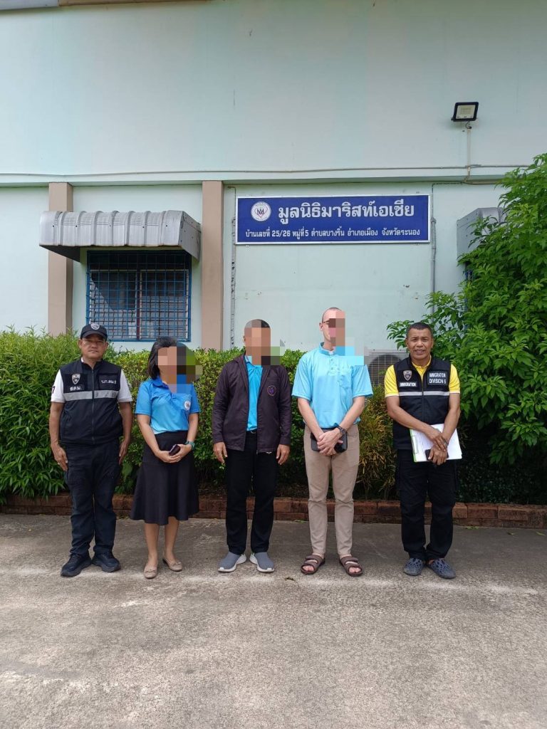 🔸: ภายใต้การสั่งการของ พ.ต.อ.เด่นชาย เจริญยุทธ ผกก.ตม.จว.ระนอง, พ.ต.ท.พิษณุ เบี้ยแก้ว รอง ผกก.ตม.จว.ระนอง, พ.ต.ท.เอกลักษณ์ นุ่นปาน สว.ตม.จว.ระนอง สั่งการให้ งานสืบสวน ตม.จว.ระนอง ตรวจสอบคนต่างด้าวสัญชาตินิวซีแลนด์ ขออนุญาตอยู่ในราชอาณาจักรเป็นการชั่วคราว เหตุผล อาสาสมัครมูลนิธิ มาริสท์เอเชีย สถานที่ตรวจสอบ สำนักงานมูลนิธิ มาริสท์เอเซีย (ศูนย์การเรียนรู้ชุมชนสำนักสงฆ์หมู่ 5 เทศบาลเมืองบางริ้น) ตั้งอยู่เลขที่ 25/26 ม.5 ต.บางริ้น อ.เมือง จว.ระนอง