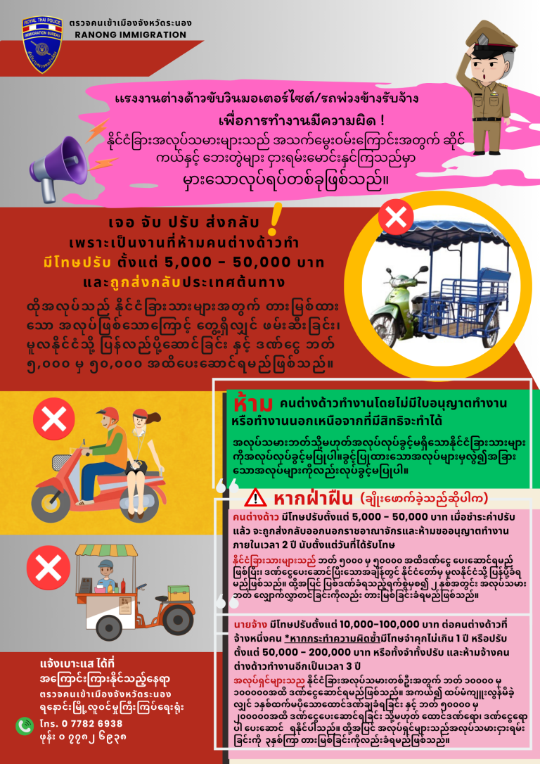 📍ထိုအလုပ်သည် နိုင်ငံခြားသားများအတွက် တားမြစ်ထားသော အလုပ်ဖြစ်သောကြောင့် တွေ့ရှိလျှင် ဖမ်းဆီးခြင်း၊ မူလနိုင်ငံသို့ ပြန်လည်ပို့ဆောင်ခြင်း နှင့် ဒဏ်ငွေ ဘတ် ၅,၀၀၀ မှ ၅၀,၀၀၀ အထိပေးဆောင်ရမည်ဖြစ်သည်။