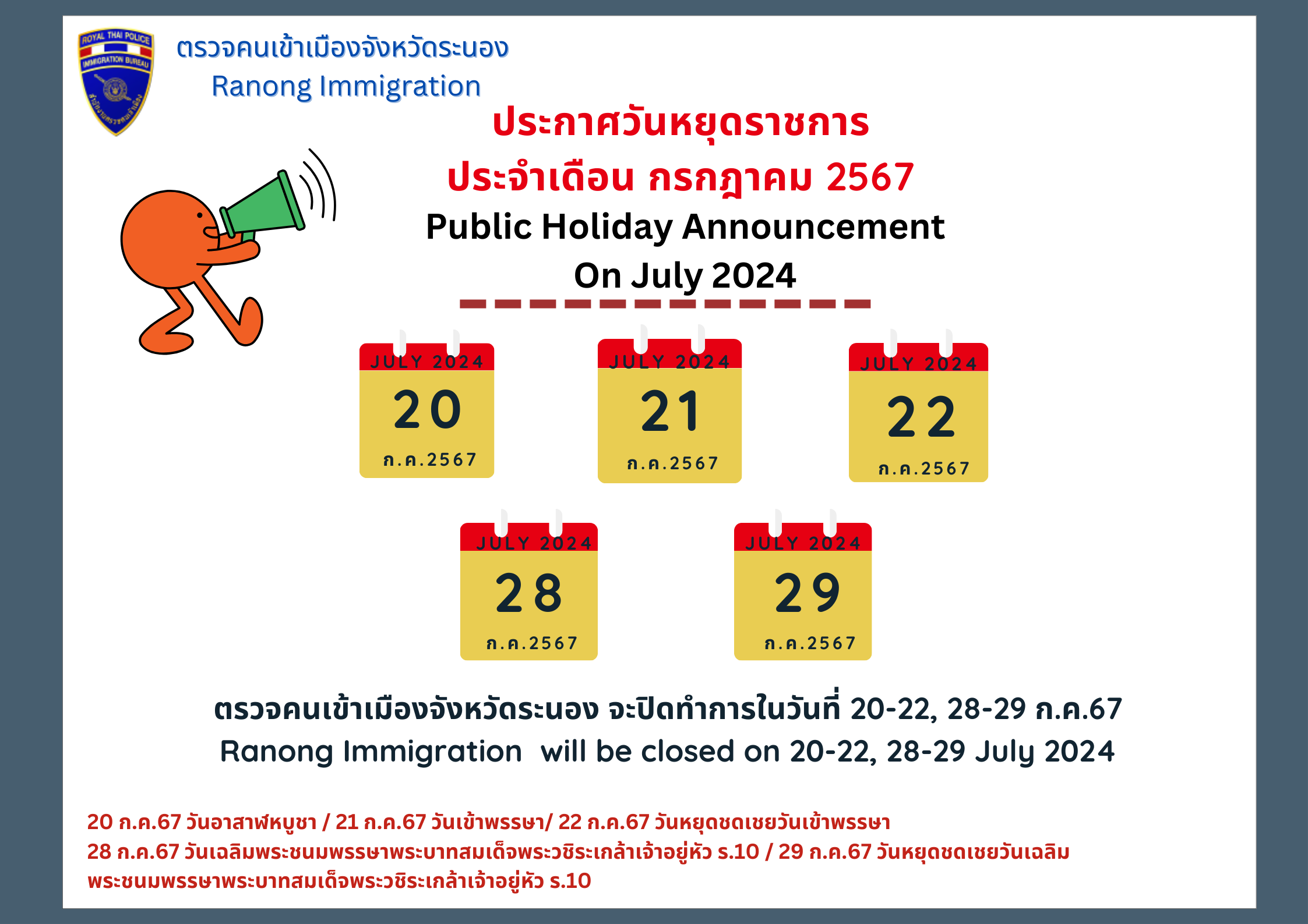 ตม.จว.ระนอง แจ้งประกาศวันหยุดราชการ ประจำเเดือน ก.ค.67
