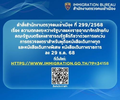 คำสั่ง สตม. ที่ 299/2568 เรื่อง ความตกลงระหว่างรัฐบาลแห่งราชอาณาจักรไทยกับคณะรัฐมนตรีแห่งส