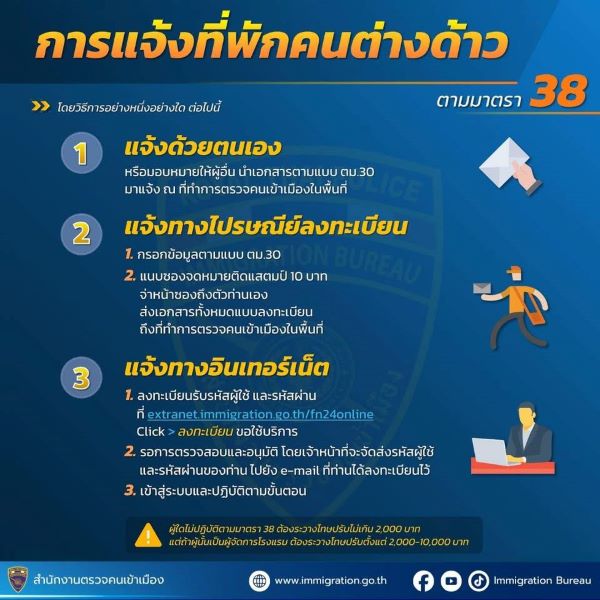 เจ้าบ้าน ผู้ครอบครอง หรือผู้ให้เช่าที่พัก ต้องแจ้งการพักอาศัยของคนต่างด้าวต่อต่อสำนักงานตรวจคนเข้าเมืองในพื้นที่